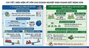 – Doanh nghiệp kinh doanh bất động sản thông qua dự án bất động sản phải có vốn chủ sở hữu không thấp hơn 20% tổng vốn đầu tư đối với dự án có quy mô sử dụng đất dưới 20 ha, không thấp hơn 15% tổng vốn đầu tư đối với dự án có quy mô sử dụng đất từ 20 ha trở lên và phải bảo đảm khả năng huy động vốn để thực hiện dự án đầu tư; trường hợp doanh nghiệp kinh doanh bất động sản đồng thời thực hiện nhiều dự án thì phải có vốn chủ sở hữu đủ phân bổ để bảo đảm tỷ lệ nêu trên của từng dự án để thực hiện toàn bộ các dự án.